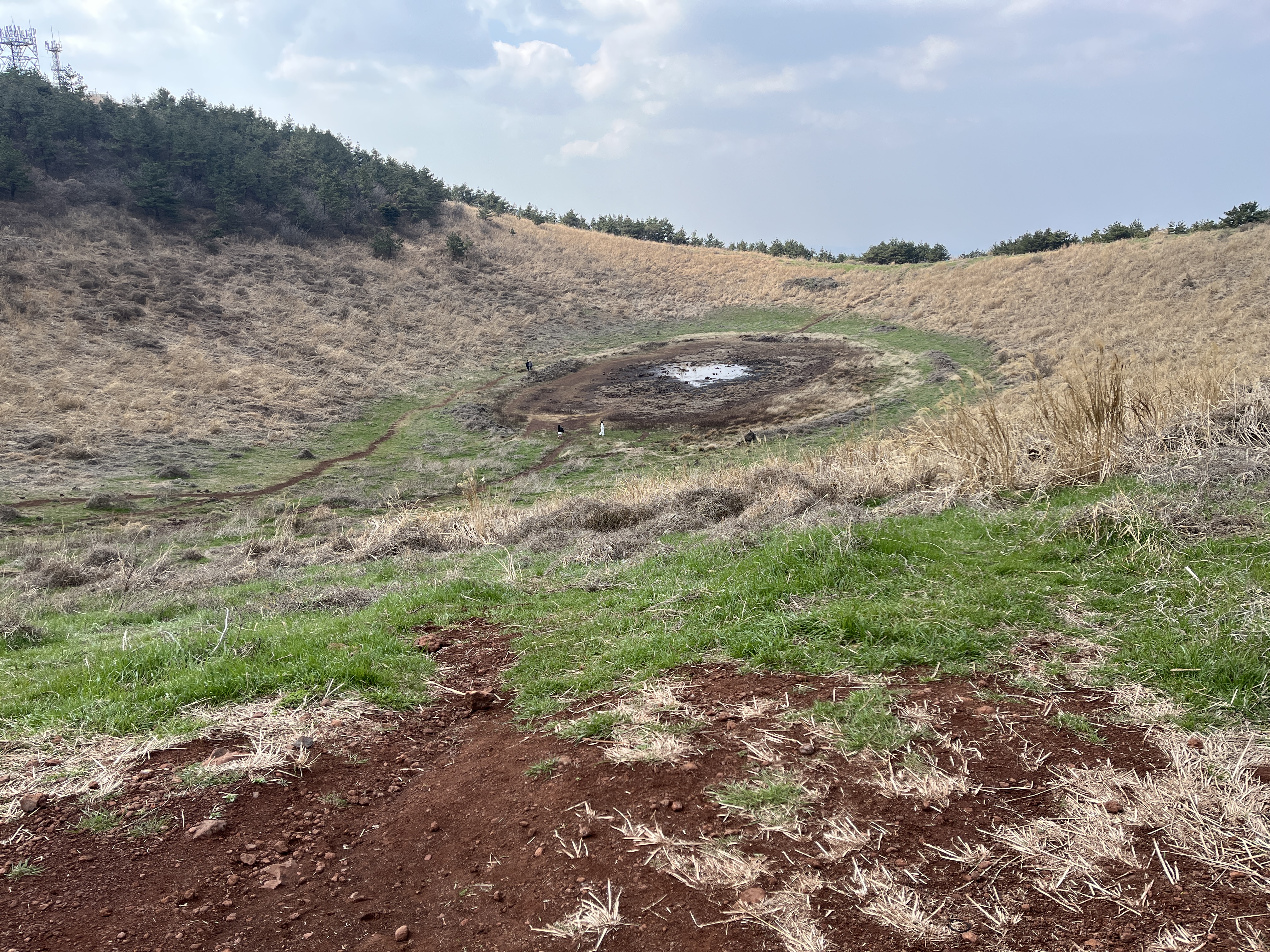 다음 행선지는 겹동백꽃을 구경할 수 있는 곳이었다. 블로그 등에는 3월 말 부터는 유채꽃과 동백나무가 같이 핀 모습을 한번에 감상할 수 있다하여 큰 기대를 갖고 향했다. 가는 길이 외길이고 사유지 같았다. 아슬아슬 길을 뚫고 도착했지만 유채밭은 갈아 엎어져 있었고, 동백나무의 동백은 다 떨어져 온데간데 없었다. 물론 다른 관광객들도 없었다. 마음이 급해진 나는 금악오름이라도 가야겠다고 생각했다. 다행히 오던 방향에서 조금만 더 가면 금악오름이었다. 20여분을 오르자 가운에 물 구덩이가 남아있는 오름 정상이 나타났다. 사진에서 보던 것보다 더 신기했다. 정상에선 한경면 전체를 조망할 수 있고 다른 오름들과 한라산 봉우리도 보였다. 내려올 때 숲길을 걸으면 좋다는 걸 본적이 있어서 표제단 길이라는 이정표가 붙은 숲길로 하산했다. 중간중간에 산짐승이 낙엽을 바사삭하는 소리가 들려서 겁을 먹은 적도 있었는데 나중에 보니 새들이 걷거나 뛰면서 내는 소리였다. 금악리에서 백종원씨가 추천했다는 파스타집에 갔는데, 막상 가보니 가격이 너무 쎄서 옆에 있는 김밥, 라면 집엘 가서 요기했다. 돼지사골을 우린 국물에 끊인 라면이라는데 특별히 내 취향은 아니었다.