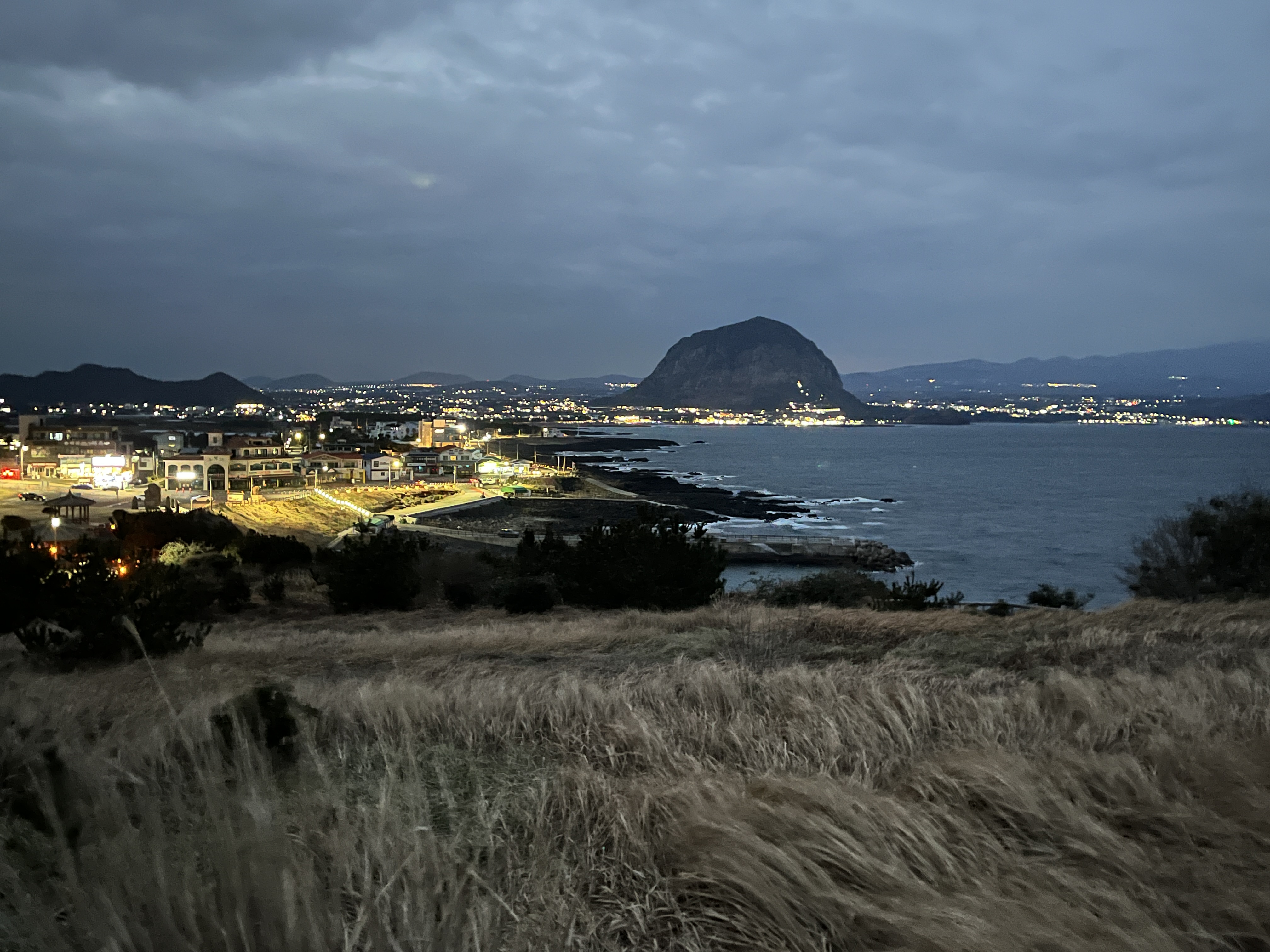 5시 책방을 나와 저녁을 먹으러 갔다. 전날 검색해 둔 양고기가 맛있다는 ‘이디글라’ 라는 작은 포차형태의 고기집이었다. 나는 양고기 1인분과 흑돼지 자투리 1인분을 시켰다. 이번 제주도 여행의 마지막 식사를 조금은 거창하게 먹고 싶었다. 양고기는 소문대로 맛있었고, 흑돼지 자투리는 비계가 많아 계속 불쇼를 했으나 나쁘지 않은 맛이었다. 배를 넉넉히 채우고선 숙소로 향하려 했는데, 식당 아주머니가 즉석에서 송악산 걷고서 들어가라고 제안을 하신다. 이미 6시 30분이었으나 그렇게 어둡지는 않았다. 잠깐만 오르고 내려오자 생각하고 송악산으로 향했다. 7시가 다 된 시간이어서 나는 걸음을 재촉해 올랐다. 송악산을 오르자 탁트인 바다와 산방산, 그리고 가가호호 불이 켜진 풍경이 너무도 시원했다. 송악산은 낮에도 멋있지만 저녁에도 이런 아름다운 풍경을 선사하는구나 라는 생각이 들었다. 오르다보니 내 뒤에 오르는 사람이 없고 내려오는 사람들 몇 팀이 전부여서 꼭대기에는 나밖에 없었다. 나는 성산 일출봉에서 완수하지 못한 미션을 이제 여기서 해야겠다고 생각했다.