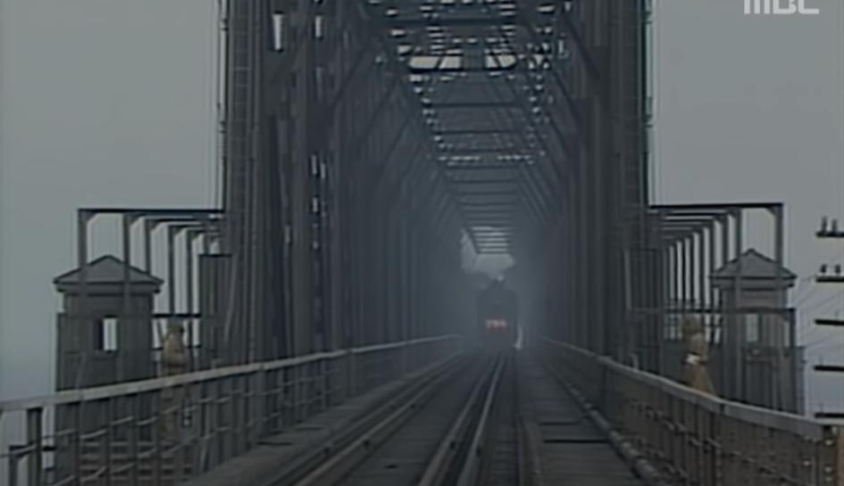 증기기관차가 압록강 철교를 지나며 기적소리를 내뿜는다.