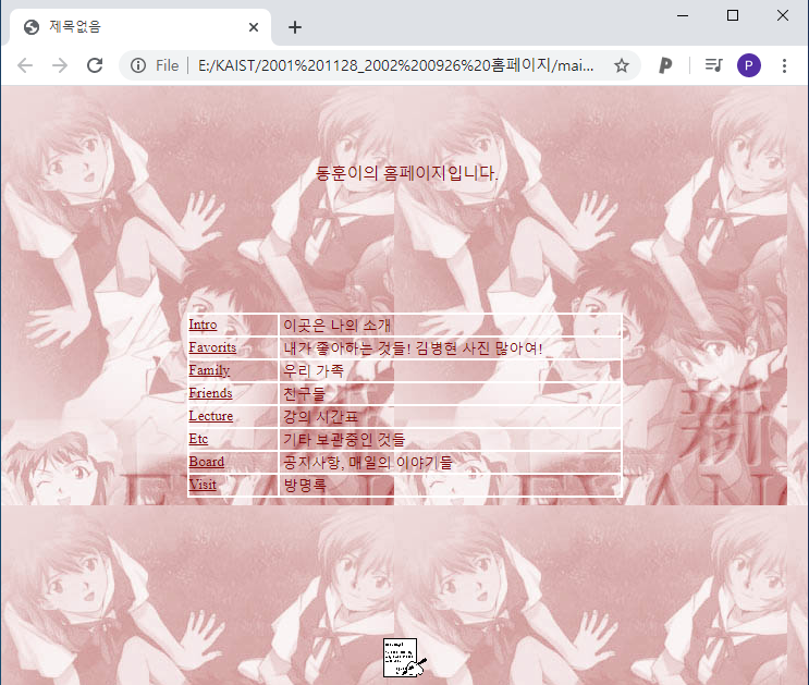 먼저, 내 첫 홈페이지는 순수 html 과 어설픈 디자인이 들어간 페이지였던 걸로 기억한다. main.html 에는 간단한 내 소개가 들어가 있었고, 몇 가지의 페이지 링크와 박찬호 사진 같은 것이 들어 있었다. 좋아라 하고 만들었는데 역시 찾아오는 사람이 없으니 3개월도 못 가서 내렸다. 얼마 지나지 않아 또 다른 비슷한 홈페이지를 만들게 되었다. 메인 테마는 BK 김병현이었다. 대문짝 만하게 검정색 애리조나 다이아몬드백스의 유니폼을 입은 김병현 선수 자신을 올려 놓았다. 그리고 cgi 게시판 소스를 가져다가 방명록도 만들었던 기억이 난다. 이 때는 단순한 html 만 사용한 것이 아니라 나모 웹 에디터를 사용해서 나름 css style 도 먹였었다. 결과는? 당연히 얼마 가지 않았다.
