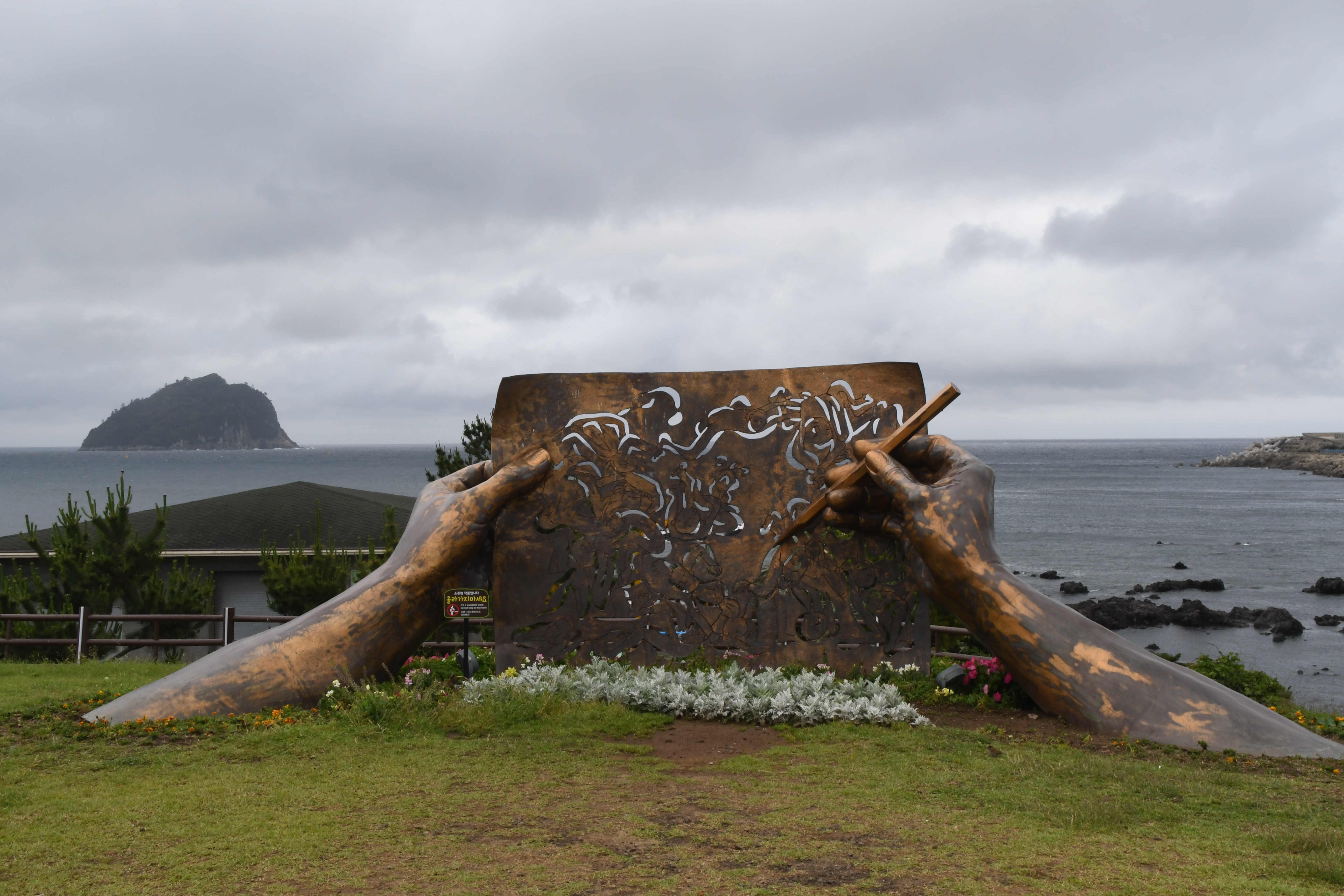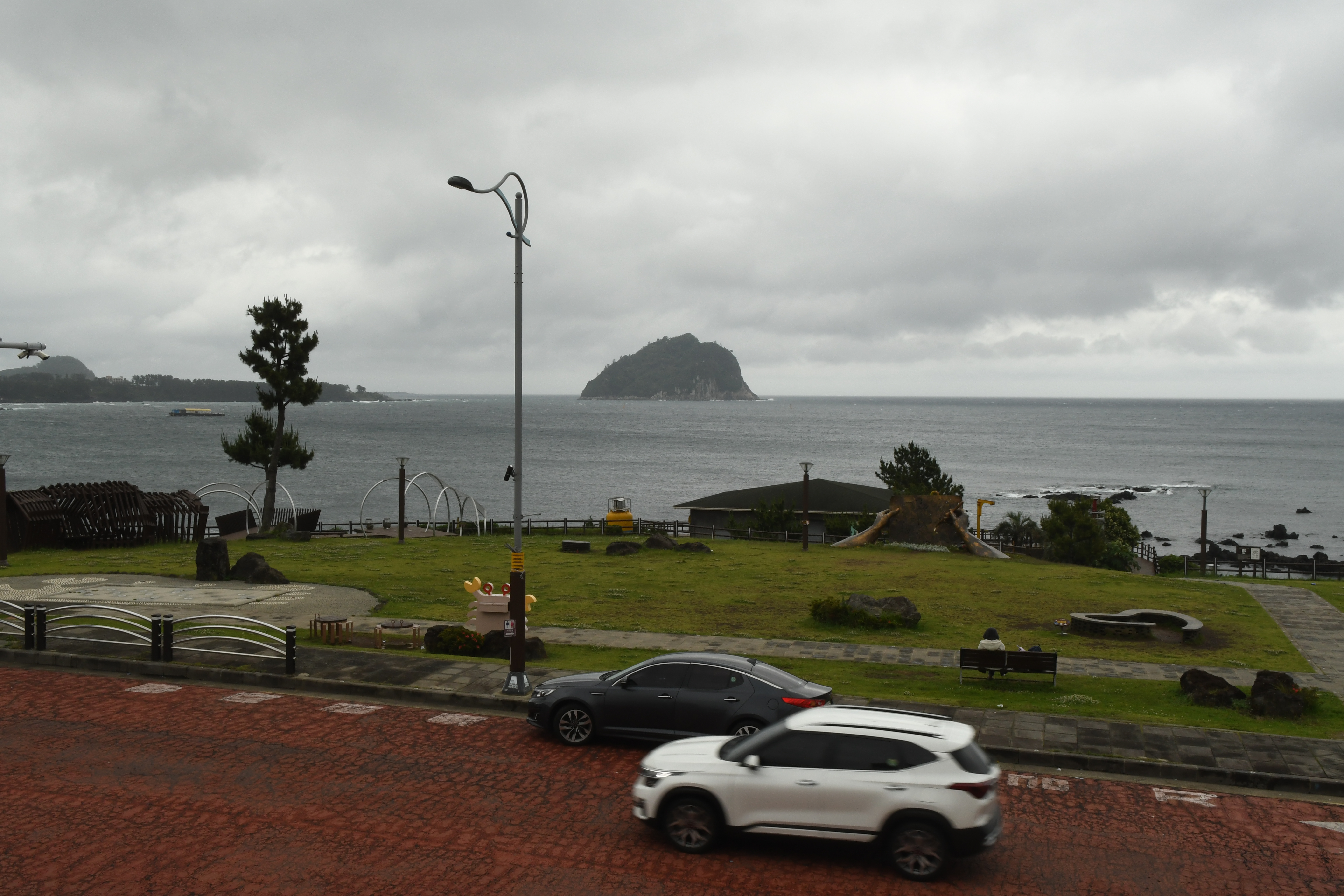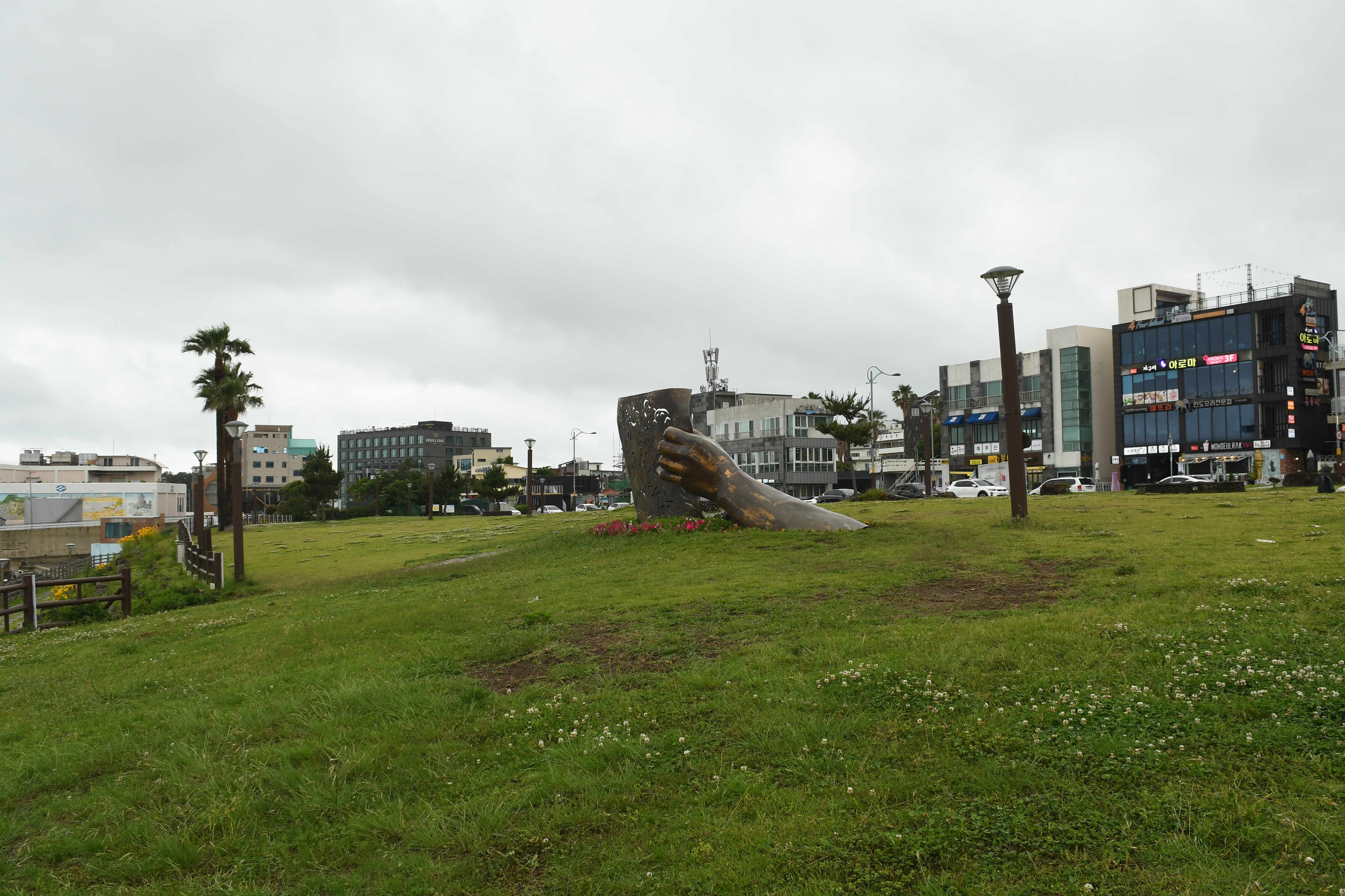 갑자기 바람이 세져서 천지연 폭포까지 가는 것은 포기하고, 반대로 틀어 자구리 공원으로 갔다. 무슨 칠십로 먹자거리라고 조성해 놓고 횟집이며 해물탕 집 같은 식당들이 연이어 있었다. 자구리 공원은 그런 약간은 삭막한 장사통에서 휴식을 주는 듯한 넓은 잔디밭과 탁트인 바다 뷰를 주는 곳이었다. 동쪽에는 서귀포항이 보였고, 앞 바다에는 섶섬이 떠있었다. 자구리 공원을 바라보는 하르비라는 커피숍에 넓직한 2층 테라스가 있었다. 흑임자 라떼를 하나 시켜놓고 마지막 여행을 기념했다. 먼가 해결된 것은 없지만 몸을 피곤하게 만들고 또 바뀐 제주의 모습을 살펴 볼 수 있는 시간이었다.