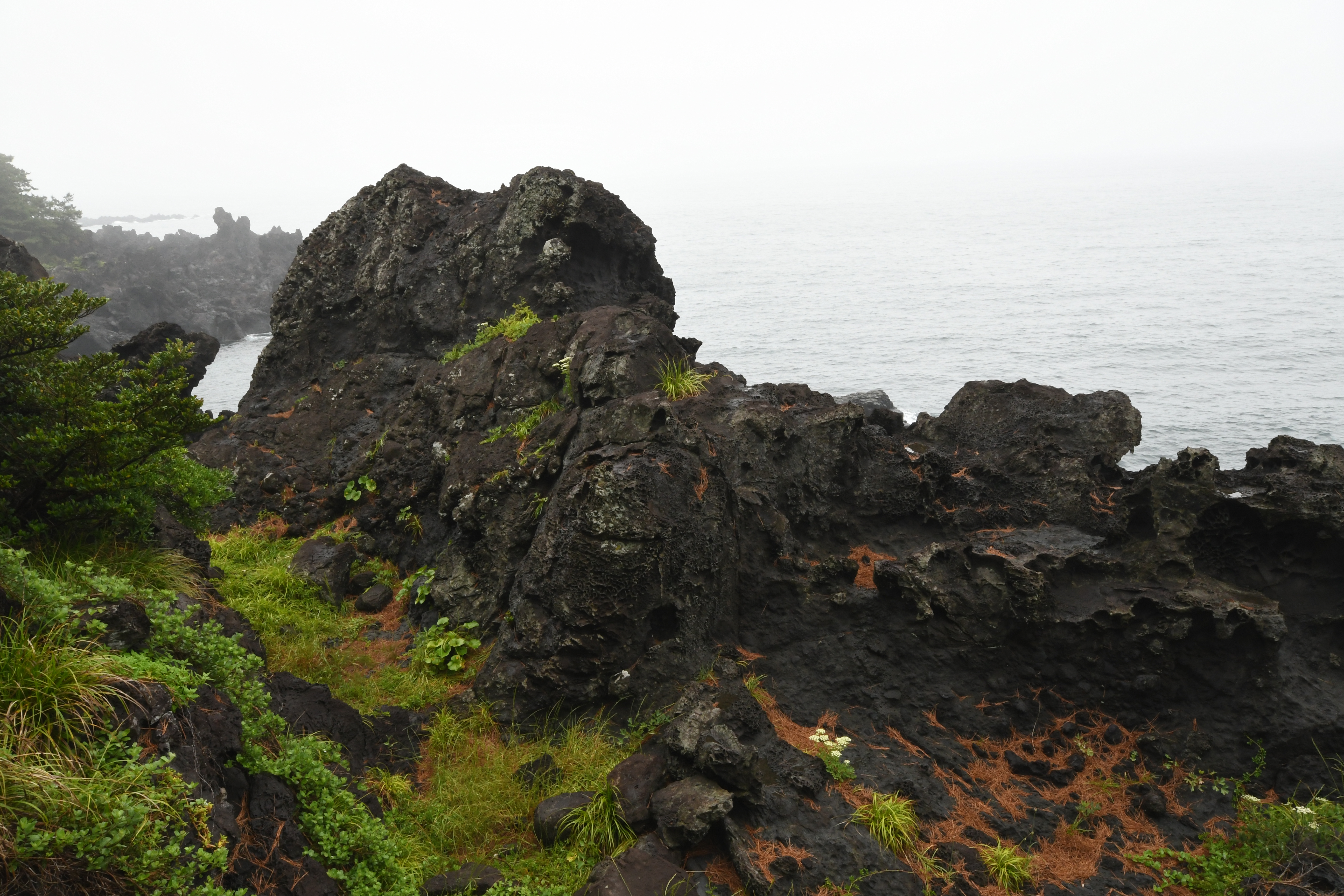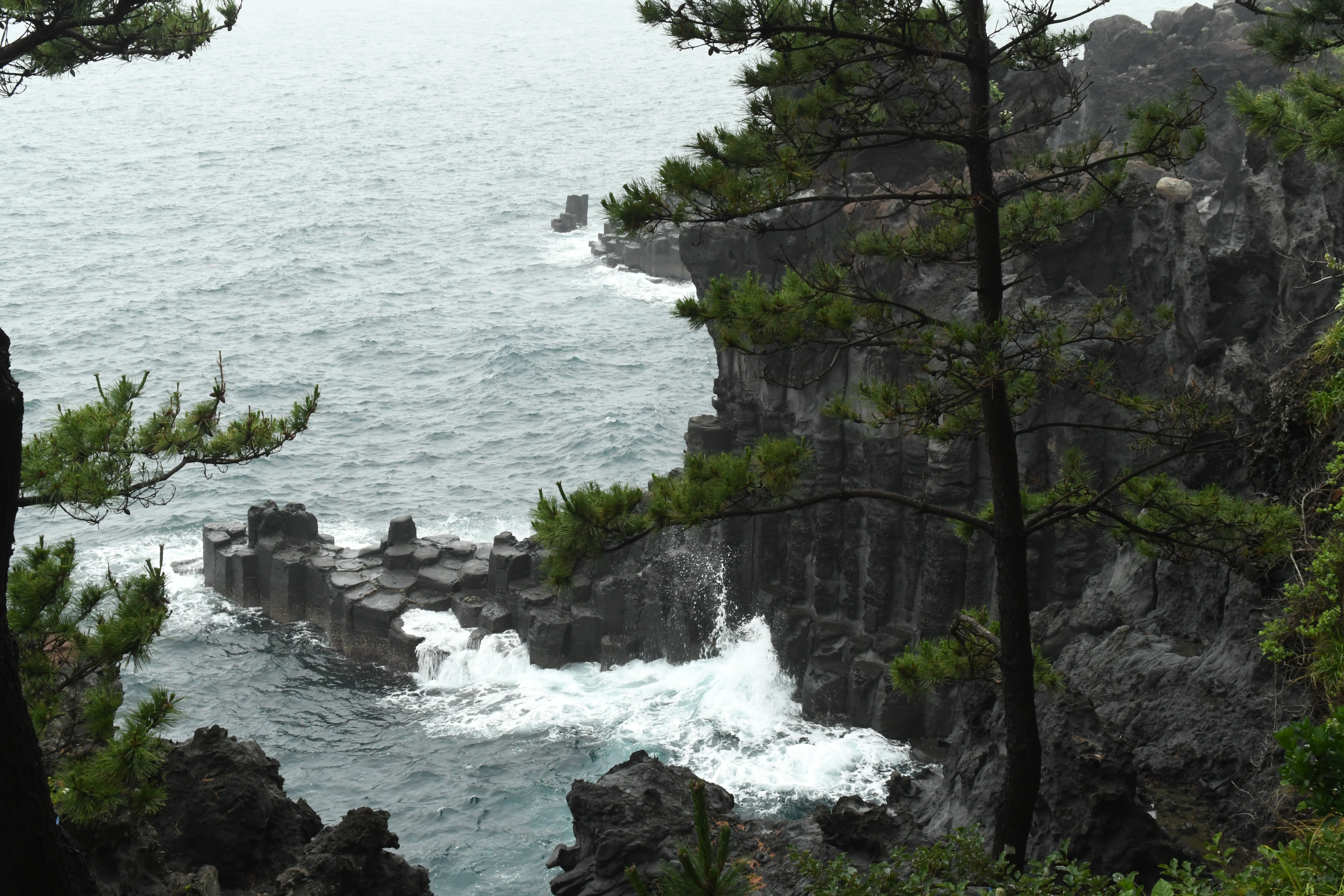 제주에서의 마지막날이다. 여행을 오면 어떤 숙제를 해결할 수 있을거라고 항상 기대하건만 마지막날엔 늘 일상으로 돌아가야 한다는 생각에 마음에 무거워진다. 이틀 연속 무리를 해서인지 아침으로 먹은 컵라면이 소화가 되지 않고 약간은 컨디션이 다운되었다. 오늘은 비 온다고 해서 딱히 여행 계획을 세워놓지 않았다. 처음엔 애월 까페거리쪽으로 가려고 했으나 어제 202번 버스를 타고 데여서 그쪽 방향으로는 가고 싶지 않았다. 일단 비오는날하면 일 순위로 떠오른 곳이 대포주상절리였다. 비오는 날 파도까지 매섭게 쳐주면 멋진 그림이 나올거 같았다. 그 다음은? 다음 목적지가 불명이다. 김영갑두모악갤러리로 가려다가 대포주상절리와 두 개를 동시에 버스로 가는 여정이 굉장히 험난할 수 있다는 걸 깨달은 다음엔 과감히 포기했다. 비자림이나 사려니 숲을 갈 수도 있었지만 오늘은 더 이상 많이 걷고 싶진 않았다. 또 운동화가 빨갛게 진흙이 묻을거라 생각하니 숲은 포기했다. 그래서 그냥 일단 대포주상절리대로 향했다. 181번 버스를 타고 1시간 10분간 열심히 달렸다. 제주 컨벤션센터에 내려서 걸어 내려가니 대포주상절리대가 나왔다. 예전 가족여행으로 왔을 때도 만족도가 꽤나 높았던 곳이다.